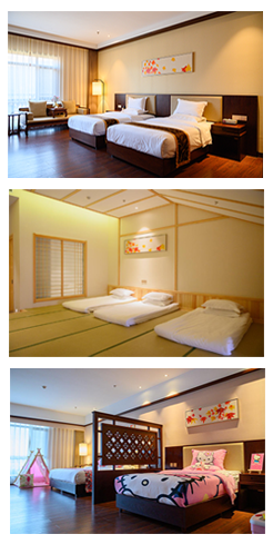 酒店總建筑面積30000多平方米,主樓高6層,設(shè)有150余間標(biāo)準(zhǔn)客房、家庭客房、日式客房和別墅客房。房?jī)?nèi)設(shè)計(jì)新穎別致,充分考慮家庭度假需求,最小房型面積在50平米以上。